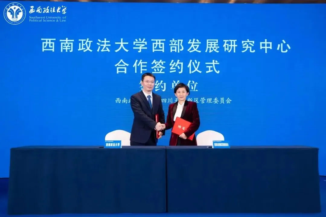 西南政法大学副校长周尚君代表学校与四川天府新区管理委员会、成都万华新城发展股份有限公司、勤为科技有限公司、四川康悦律师事务所签署合作协议。协议的签署,标志着西南政法大学与西部地区的校地合作在科研创新、产业发展、课题攻关、成果转化、涉外法律服务等领域迈出了关键的一步。