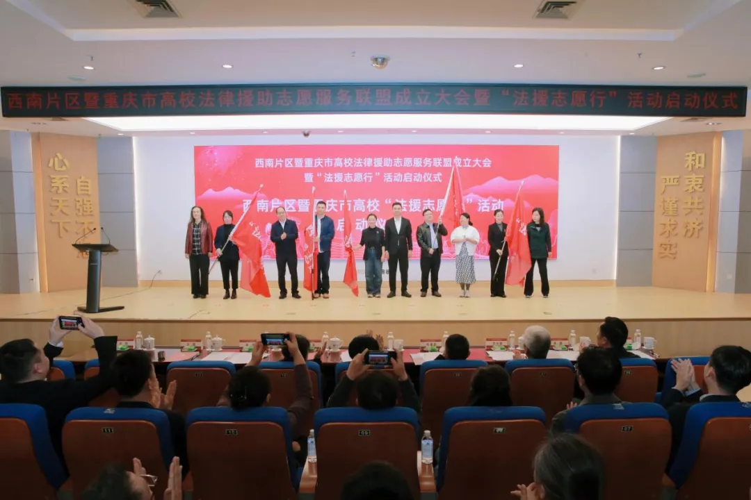 在联盟成立的基础上,西南片区暨重庆市高校“法援志愿行”活动同步启动。重庆市委社会工作部二级巡视员漆治建宣布活动启动,共青团重庆市委副书记黄宗华与川黔滇藏四省(区)司法厅相关领导为五省(区、市)牵头高校代表授旗,标志着西南片区高校法援志愿服务系列活动全面开启,精准化、专业化的法治服务将持续走进基层一线。