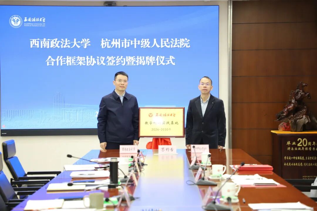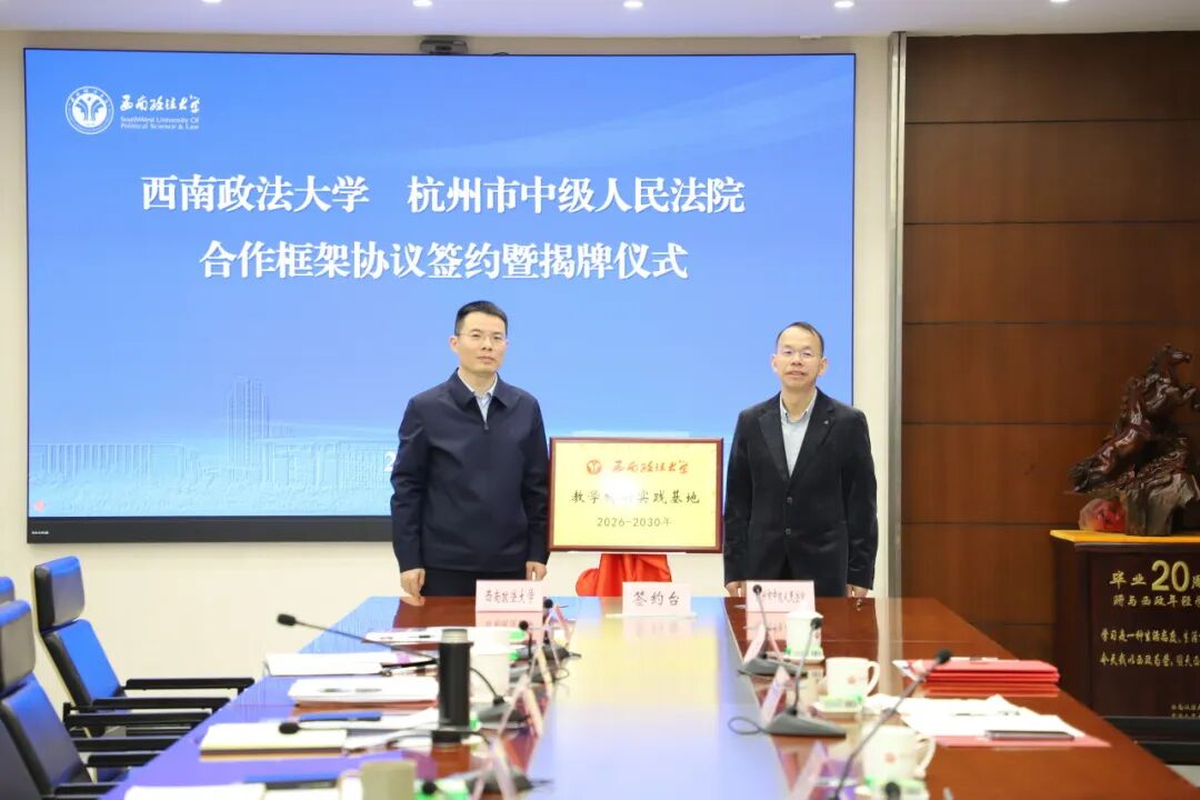 西南政法大学副校长周尚君与杭州市中级人民法院党组成员、副院长毛煜焕同志共同为西南政法大学“教学科研实践基地”揭牌。