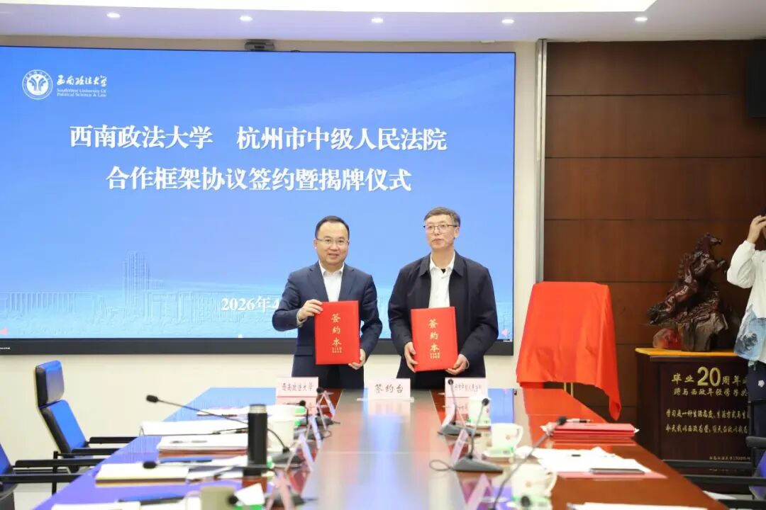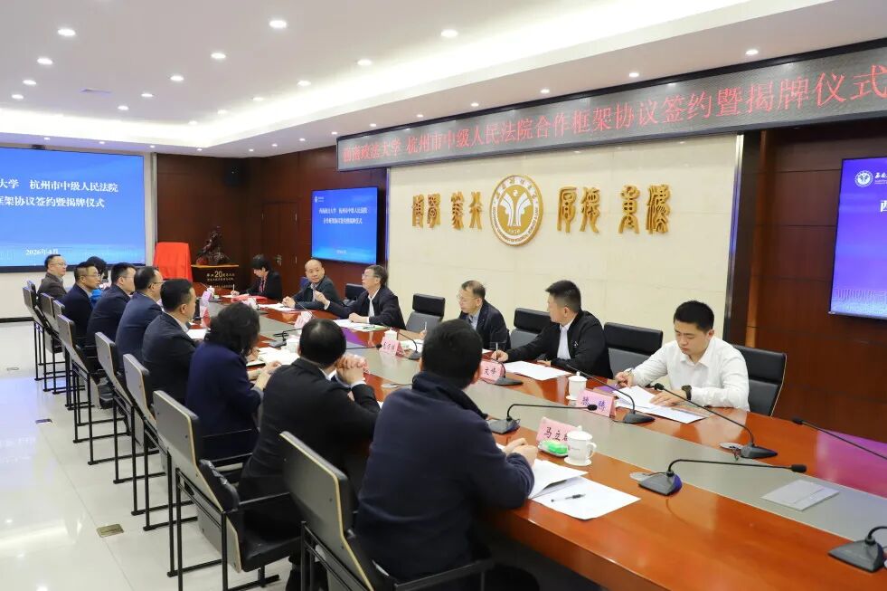 西政网讯 (记者 李心怡)4月3日上午,西南政法大学与杭州市中级人民法院签署战略合作框架协议。西南政法大学党委副书记、校长林维,杭州市中级人民法院党组书记、院长唐学兵出席会议并致辞。西南政法大学副校长周尚君主持会议。
