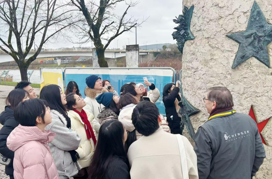 在卢森堡摩泽尔河畔的申根小镇,学生们探访了申根纪念碑、玛丽·阿斯特丽德公主号游轮和申根博物馆,深入了解了《申根协定》的签署背景、谈判过程及其对人员自由流动的深远影响。